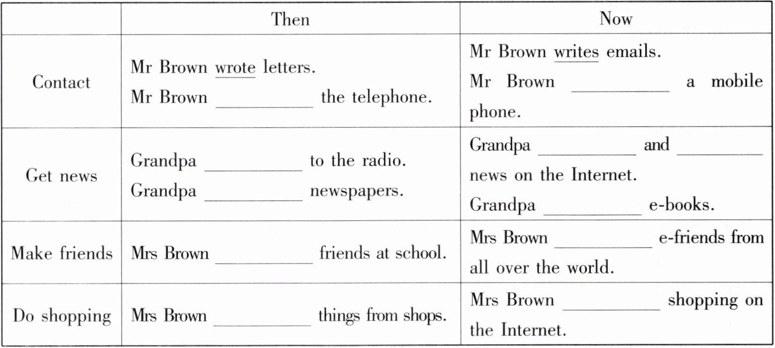 | Get news | Grandpa ______ to the radio. Grandpa ______ newspapers. | Grandpa ______ and ______ news on the Internet. Grandpa ______ e-books. |