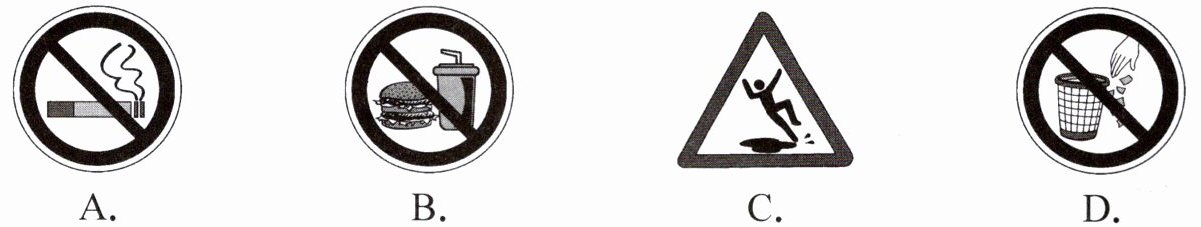 A. No smoking. B. Danger! C. Wet floor. D. No eating or drinking.