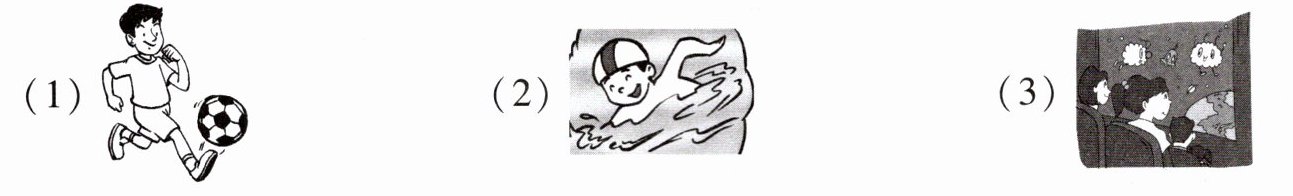 (1)He likes playing football.(2)He likes swimming.(3)She likes watching films.