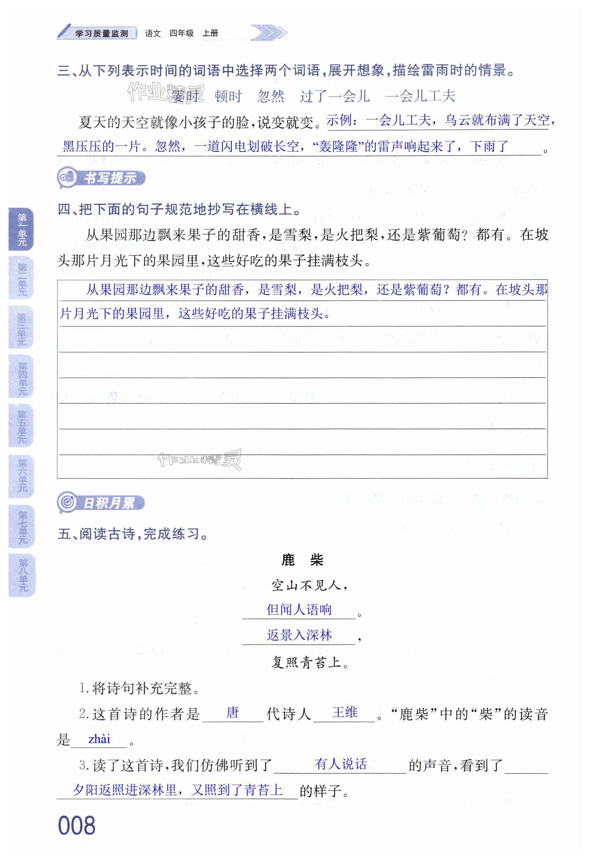 注:目前有些书本章节名称可能整理的还不是很完善,但都是按照顺序排列的,请同学们按照顺序仔细查找。练习册 2024年学习质量监测四年级语文上册人教版 答案主要是用来给同学们做完题方便对答案用的,请勿直接抄袭。