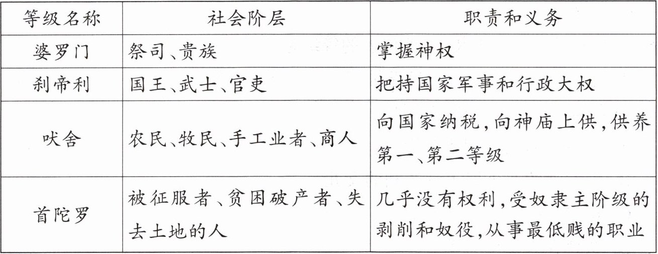 |首陀罗|被征服者、贫困破产者、失去土地的人|几乎没有权利,受奴隶主阶级的剥削和奴役,从事最低贱的职业|