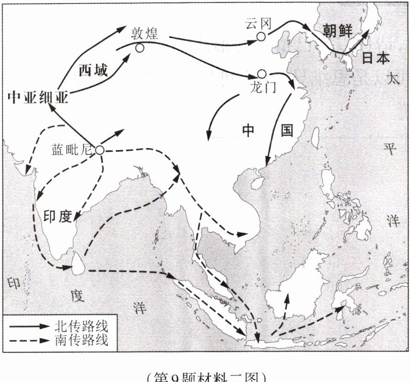(2) 对比材料三中古代印度和中国古代石窟的佛像,指出它们的共同特点。