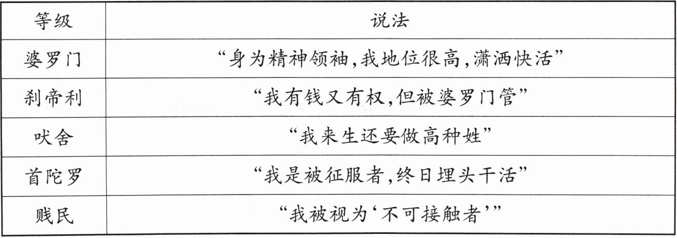 该制度是种姓制度。婆罗门说的是对的,因为作为第一等级,他们掌管祭祀,可以说自己是“精神领袖”“地位很高”。刹帝利说的也有道理,他们处于第二等级,掌握军事和行政权力,但地位低于婆罗门。吠舍说的并不正确,吠舍是第三等级,从事农业、畜牧业和商业,各等级世代相袭,贵贱分明,不得从事高等级的人的职业。首陀罗和贱民的说法是对的,首陀罗要为前三个等级服务,贱民在社会上遭到歧视和凌辱。