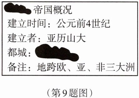 9. 右图所示为某同学课堂笔记的部分内容。图中两处被墨水污渍覆盖的内容应为 ( )