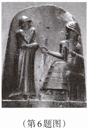 6. 右图所示石柱浮雕描述的是古巴比伦人的太阳神沙玛什向国王汉谟拉比授予权杖的画面,其寓意是 ( )