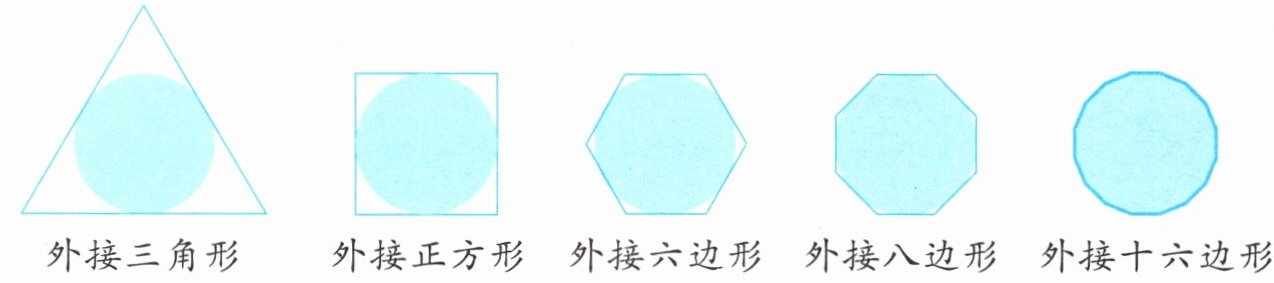 答:随着边数的不断增加,外接图形的面积越来越接近圆的面积。
