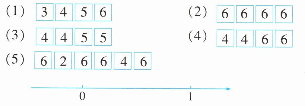 3. 有 5 套卡片,每套抽中“6”的可能性是多少?在直线上表示出来。