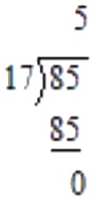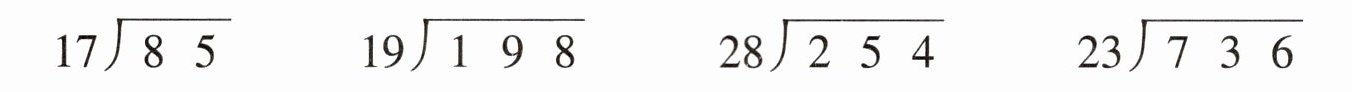 (图示为17除85列竖式计算,商5,余0;图示为19除198列竖式计算,19乘10,余8;图示为28除254列竖式计算,商9余2;图示为23除736列竖式计算,商32)