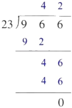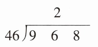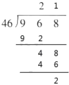 $\begin{array}{r} 21\\ 46\overline{)968}\\ \underline{92}\\ 48\\ \underline{46}\\ 2\end{array}$