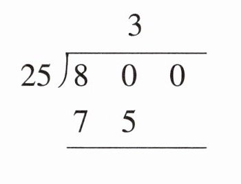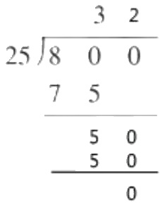$\begin{array}{r} 32\\ 25\overline{)800}\\ \underline{75}\\ 50\\ \underline{50}\\ 0\end{array}$