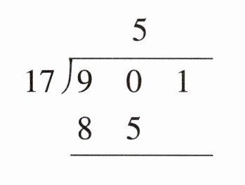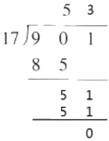 $\begin{array}{r} 53\\ 17\overline{)901}\\ \underline{85}\\ 51\\ \underline{51}\\ 0\end{array}$