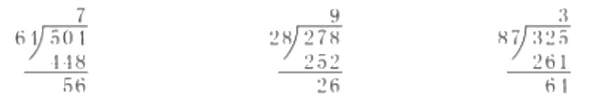 504÷64 = 7……56 278÷28 = 9……26 325÷87 = 3……64