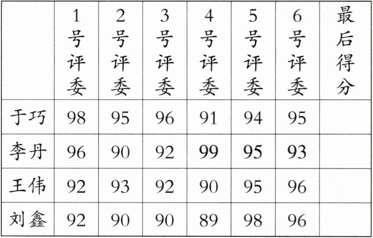 | | 1号评委 | 2号评委 | 3号评委 | 4号评委 | 5号评委 | 6号评委 | 最后得分 |