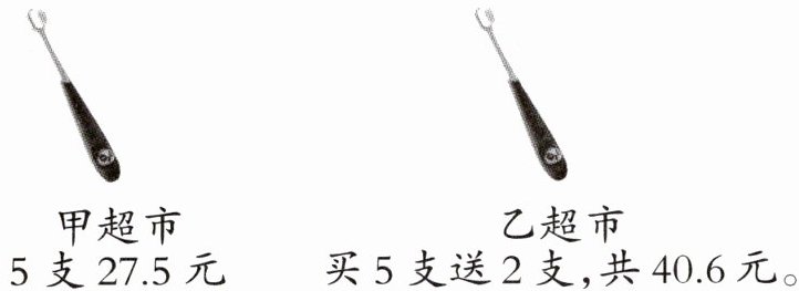 甲超市 5支27.5元 乙超市 买5支送2支,共40.6元。