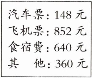 8. 国庆长假期间,琪琪和爸爸、妈妈一起去旅游。你能帮他们算一算一共花了多少钱吗?