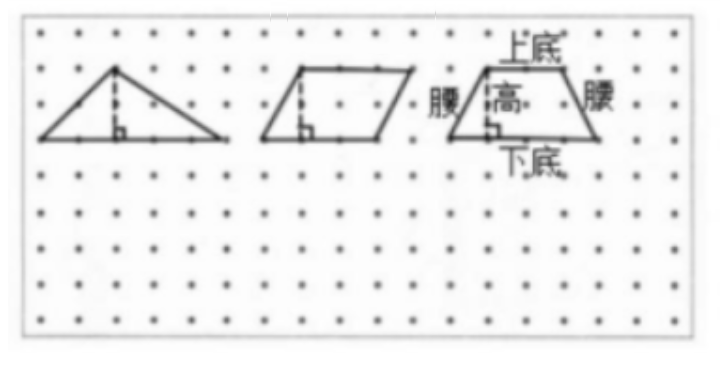 (3)在点子图上画一个等腰梯形,画出它的一条高,并标出各部分的名称(高、上底、下底、腰)。