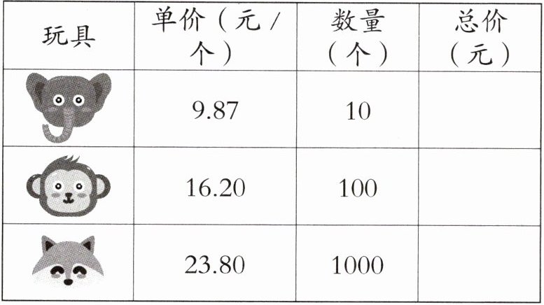 | 玩具 | 单价(元/个) | 数量(个) | 总价(元) |