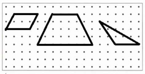 6.在下面的点子图中画出底长3cm、高2cm的平行四边形,4cm的等腰梯形,底和高都是3cm的钝角三角形各一个。(点子图中每相邻的两点之间的距离为1cm。)