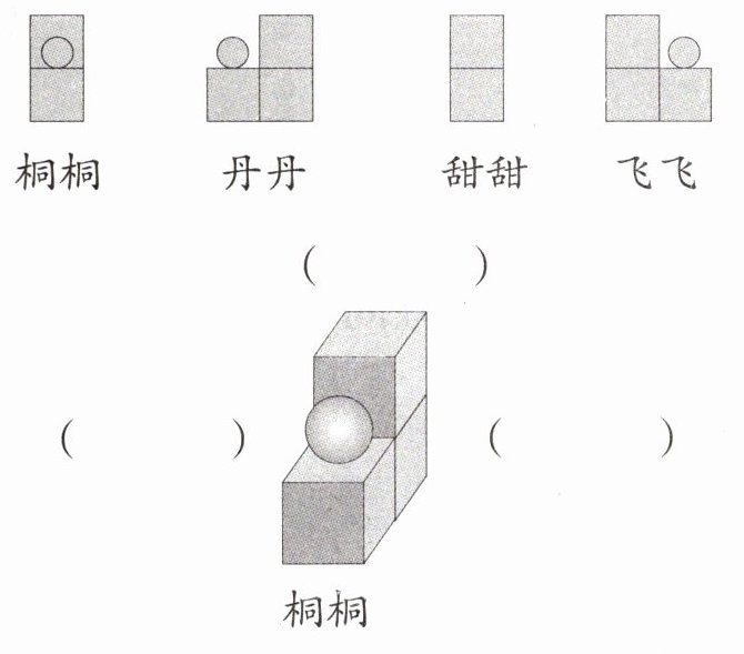 6. 下面分别是桐桐、丹丹、甜甜、飞飞所看到物体的形状。请你把其中3人的名字填写在相应的括号中。