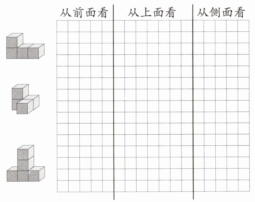 4. 在方格纸上画出从前面、上面和侧面看到的图形。