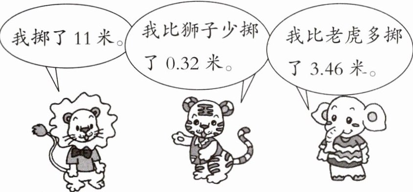 我掷了11米。 我比狮子少掷了0.32米。 我比老虎多掷了3.46米。