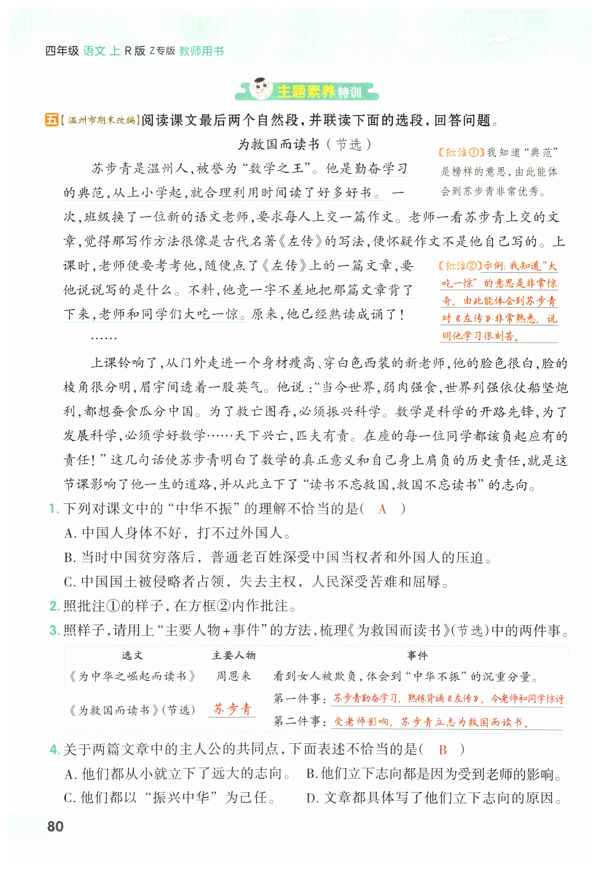注:目前有些书本章节名称可能整理的还不是很完善,但都是按照顺序排列的,请同学们按照顺序仔细查找。练习册 2024年综合应用创新题典中点四年级语文上册人教版浙江专版 答案主要是用来给同学们做完题方便对答案用的,请勿直接抄袭。