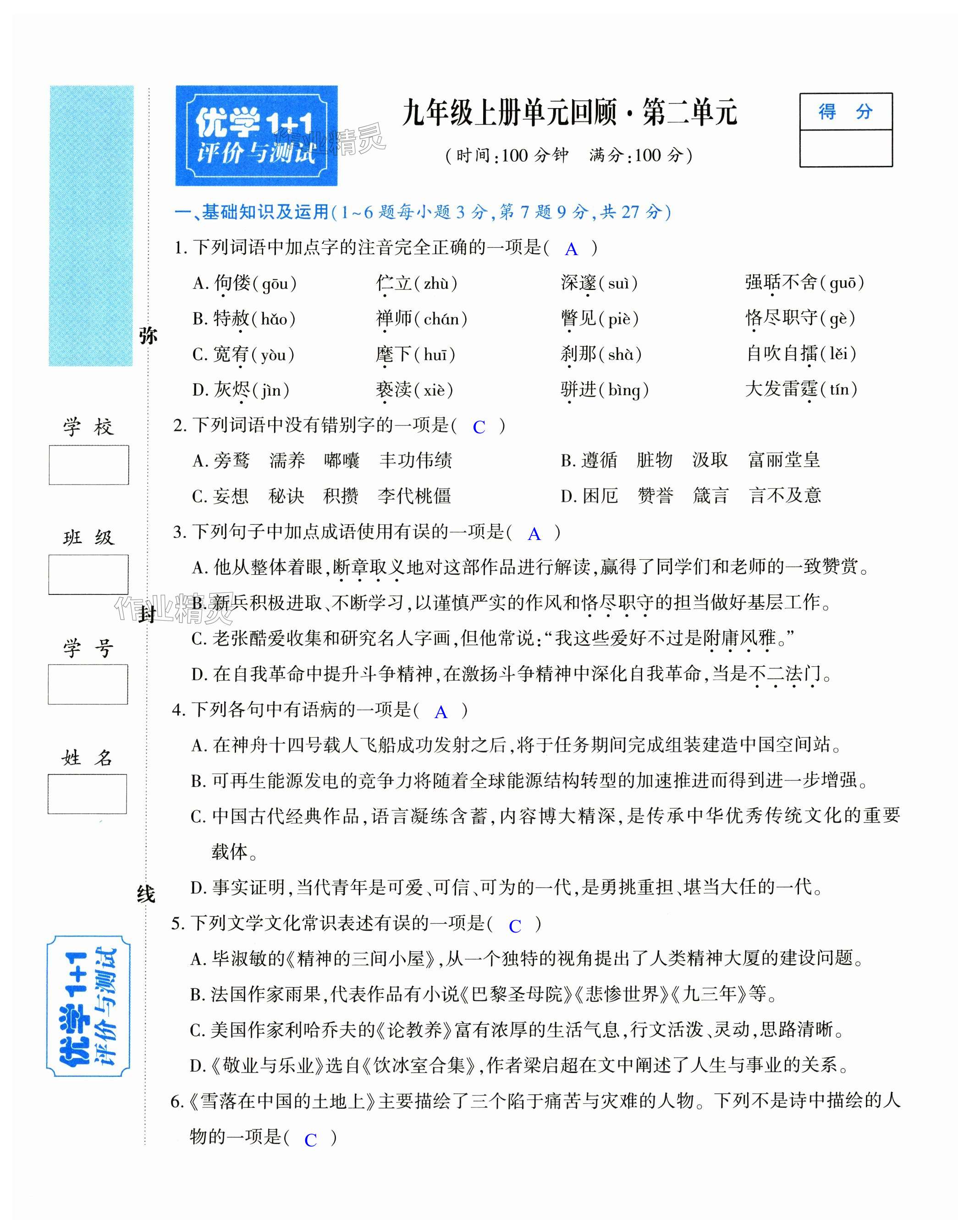 注:目前有些书本章节名称可能整理的还不是很完善,但都是按照顺序排列的,请同学们按照顺序仔细查找。练习册 2024年优学1+1评价与测试九年级语文全一册人教版 答案主要是用来给同学们做完题方便对答案用的,请勿直接抄袭。