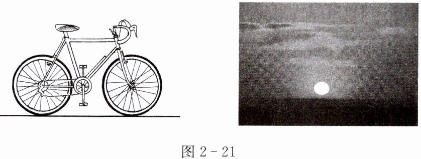 如果把图2-21的两幅照片中的车轮、太阳看作圆,地面、地平线看作直线,你能分别说出车轮与地面以及太阳与地平线的位置关系吗?