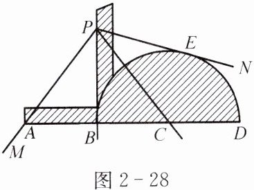 你知道三等分角仪吗?用材料制成如图2-28的阴影部分的形状,使AB与半圆的半径BC、CD相等,PB⊥AD,这便做成了“三等分角仪”。如果要把∠MPN三等分时,可将三等分角仪放在∠MPN上,适当调整它的位置,使PB通过角的顶点P,使点A落在角的边PM上,使角的另一边与半圆相切于点E,最后通过B、C两点分别作两条射线PB、PC,则∠MPB= ∠BPC= ∠CPN。为什么?