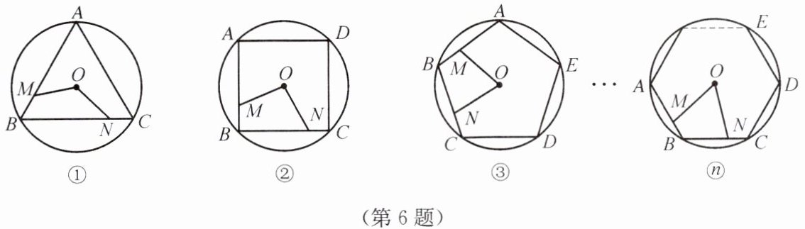 6. 如图①、②、③、…、ⓝ,在$\odot O$的内接正三角形ABC、正四边形ABCD、正五边形ABCDE、…、正n边形$ABCDE…$中,点M、N分别在边AB、BC上,且$BM= CN$,连接OM、ON.