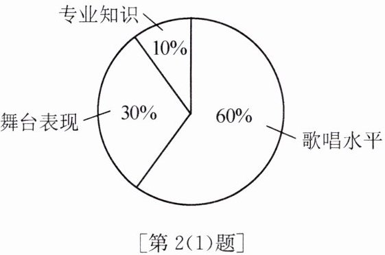 2. (1)某校组织一次歌唱比赛,最终得分由歌唱水平、舞台表现、专业知识三部分组成,每部分所占比例如图所示. 小红这三项的得分分别为 80 分、90 分、90 分,这次比赛中,小红的总分为______分.