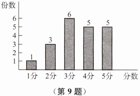 9. 某公司为提高服务质量,对某个部门开展了客户满意度问卷调查,客户满意度由低到高分为 1 分、2 分、3 分、4 分、5 分.公司规定:若客户所评分数的平均数或中位数低于 3.5 分,则该部门需要进行整改.工作人员从收回的问卷中随机抽取了20 份,并根据这 20 份问卷中的客户所评分数绘制成如下统计图.