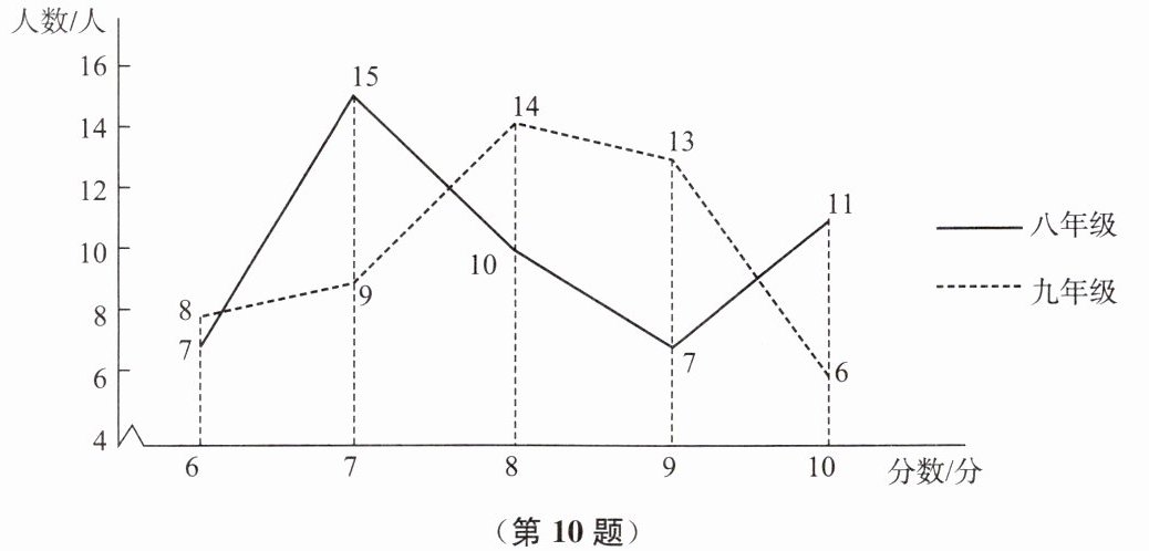 10. 学校在八、九年级各抽取 50 名学生开展科普知识竞赛,为便于统计成绩,制定了取整数的计分方式,满分 10 分.竞赛成绩的数据如图和表所示: