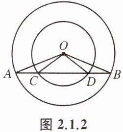 例1 如图2.1.2,大圆的弦AB交小圆于点C、D,∠AOC与∠BOD相等吗?为什么?