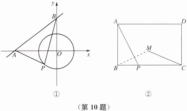 10. (1)如图①,一次函数 y= 3/4x+3 的图像与坐标轴交于 A、B 两点,⊙O 的半径为 2,P 是⊙O 上的一个动点,△ABP 面积的最大值为 .