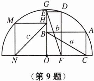 9. 如图,点A、D、G、M在半圆O上,四边形ABOC、DEOF、HMNO均为矩形,设BC= a,EF= b,NH= c.下列各式中,正确的是( )