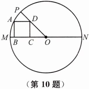10. 如图,在⊙O中,直径MN= 10,正方形ABCD的四个顶点分别在半径OM、OP以及⊙O上,且∠POM= 45°.求正方形的边长.