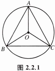 例1 如图 2.2.1,在$\odot O$中,$\overset{\frown}{AB}= \overset{\frown}{AC}$,$\angle ACB= 60^{\circ}$.$\angle AOB= \angle BOC= \angle AOC$吗?为什么?
