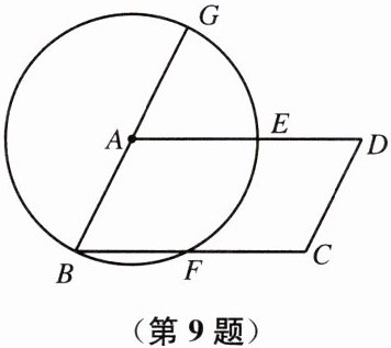 9. 如图,以$□ ABCD$的顶点 A 为圆心,AB 为半径作圆,分别交 AD、BC 于点 E、F,延长 BA 交$\odot A$于点 G.