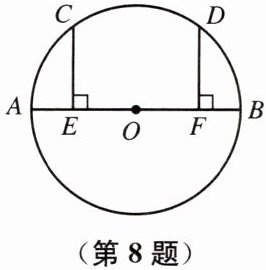 8. 如图,AB 是$\odot O$的直径,点 C、D 在$\odot O$上,且$CE\perp AB$,$DF\perp AB$,垂足分别为 E、F,且$AE= BF$.$\overset{\frown}{AC}与\overset{\frown}{BD}$相等吗?为什么?