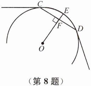 8. 如图,一条公路的转弯处是一段圆弧(即图中$\widehat{CD}$,点O是$\widehat{CD}$的圆心),其中CD= 600 m,E是$\widehat{CD}$上一点,且OE⊥CD,垂足为F,EF= 90 m.求这段弯路的半径.