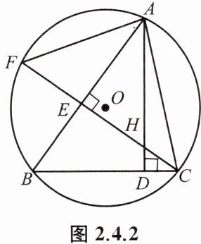 例2 如图2.4.2,A、B、C三点在⊙O上,△ABC的高AD、CE相交于点H,CE的延长线交⊙O于点F.