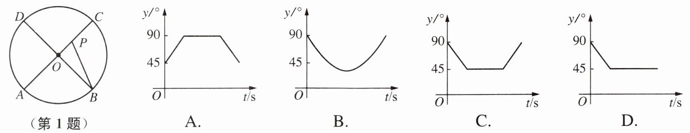 1. 如图,A、B、C、D为⊙O的四等分点,动点P从圆心O出发,沿O—C—D—O的路线做匀速运动.设运动时间为t s,∠APB的度数为y°,下列图像中,最能恰当表示y与t之间函数关系的是( )