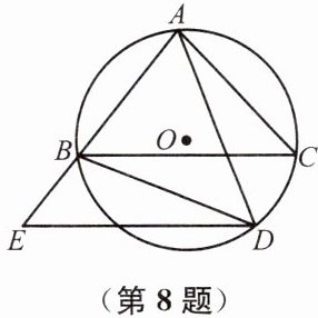 8. 如图,△ABC内接于⊙O,且∠ABC= ∠C,点D在$\overset{\frown}{BC}$上运动,过点D作DE//BC,交AB延长线于点E,连接AD、BD.