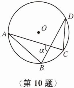 10. 如图,⊙O的半径为1 cm,弦AB、CD的长度分别为$\sqrt{2}$ cm、1 cm,求弦AC、BD所夹的锐角α.