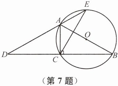 7. 如图,AB为⊙O的直径,点C在⊙O上,延长BC到点D,使DC= CB,延长DA交⊙O于点E,连接AC、CE.