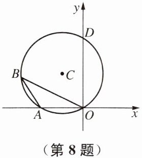 8. 如图,在平面直角坐标系中,⊙C过原点,并与坐标轴分别交于点A、D,∠OBA= 30°,点D的坐标为(0,3),则点A、C的坐标分别为______,______.