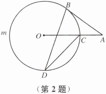 2. 如图,AB是$\odot O$的切线,切点为B,连接AO,与$\odot O$交于点C,D为$\overset{\frown}{BmC}$上一点,连接BD、CD.若$\angle A= 36^\circ$,则$\angle BDC$的度数为______.