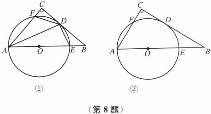 8. 在$\triangle ABC$中,$\angle C= 90^\circ$,以边AB上的点O为圆心,OA为半径作圆,与BC相切于点D,分别交AB、AC于点E、F.