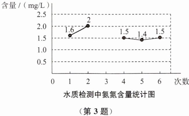 3. 为监测某河道水质,进行了6次水质检测,绘制了如图的氨氮含量(单位:mg/L)折线统计图.若这6次水质检测氨氮含量平均数为1.5 mg/L,则第3次检测得到的氨氮含量是( )